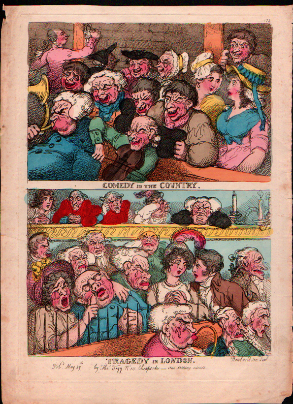 'Comedy in the Country,' and 'Tragedy in London'. This cartoon by Thomas Rowlandson, though not published until 1807, pictorializes a long-standing urban presumption—that audiences in the country are unsophisticated both in manners and in their response to a play. It is instructive therefore to contrast the view of the experienced Tate Wilkinson, in his Memoirs of 1790: 'A farce, if it possesses true humour, in London will be greatly relished and applauded. In the country, very possibly the same . . . shall be termed vile, low, vulgar, and indelicate.' And mannered comedies which 'are in London attended to as plays of wit and merit' in the country are 'not permitted, or if permitted to appear, not upon any account fashionable, which is just as bad'